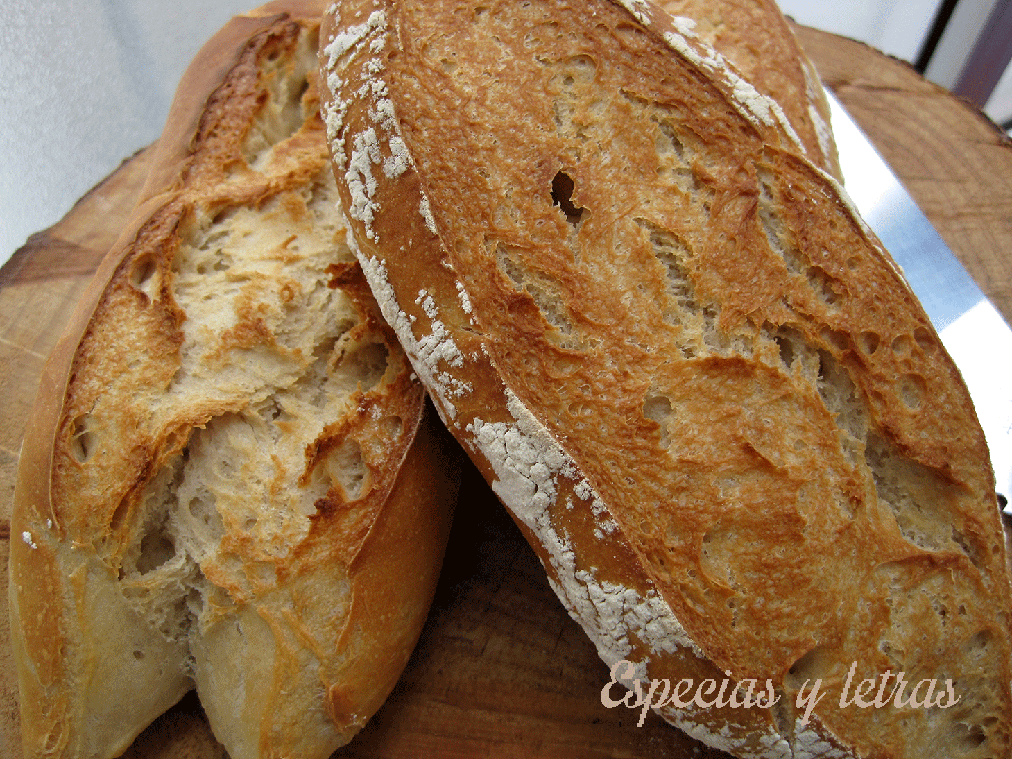 A la media hora precalentamos el horno 220ºc. Damos un corte a lo largo del pan y horneamos 25 minutos (con vapor durante 10 minutos y sin la bandeja del agua que habremos puesto, para formar el vapor).