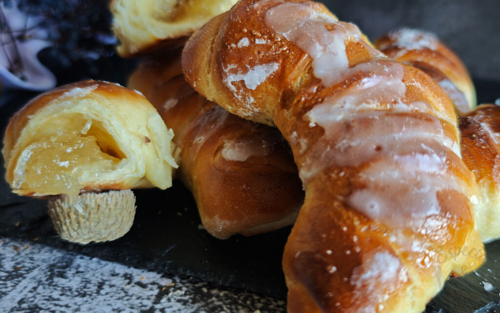 Hacemos una glasa mezclando azúcar glase con unas gotas de limón y agua. Pincelamos los brioches cuando aun están calientes. Dejamos enfriar en una rejilla.