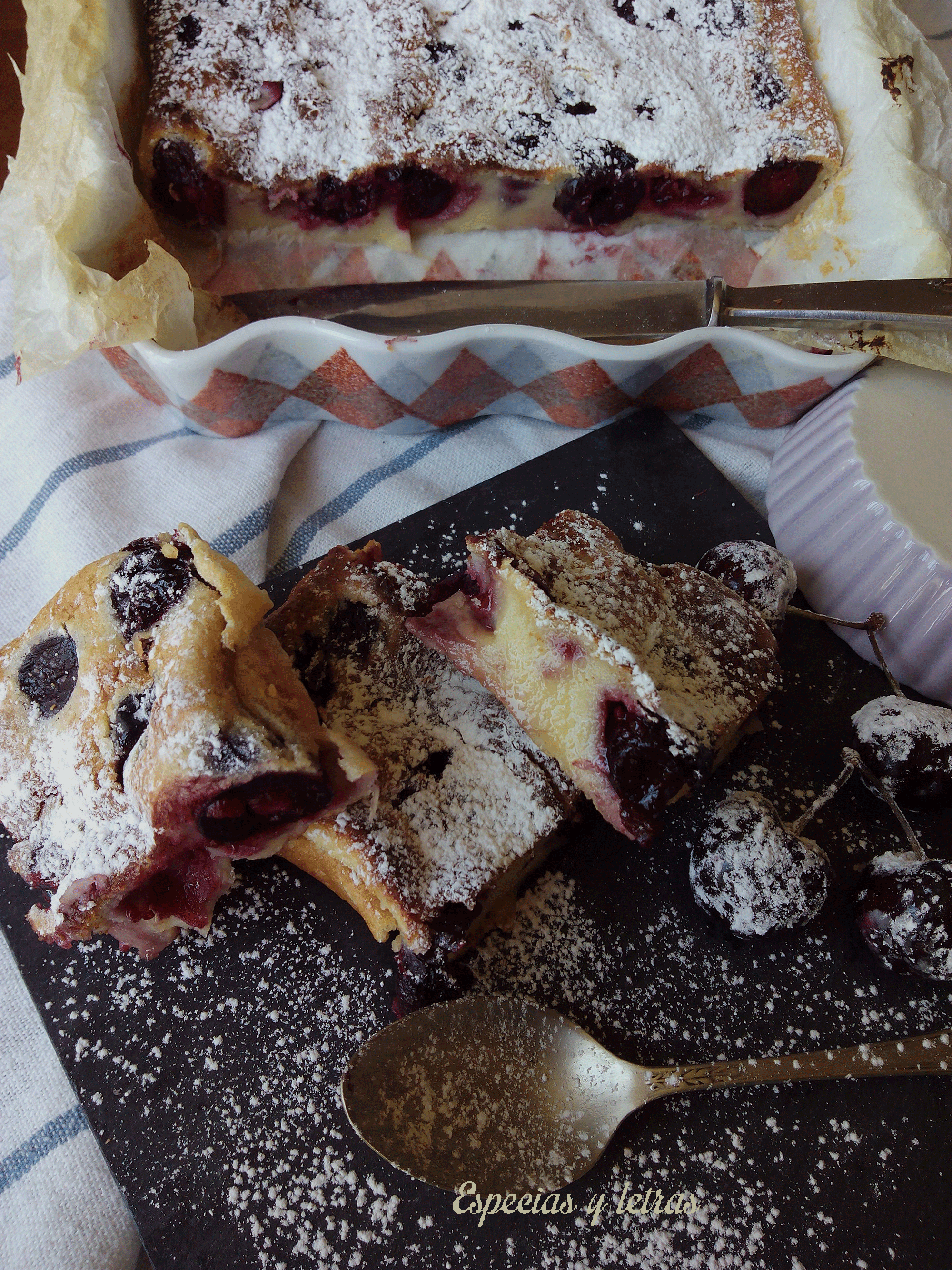 Con ayuda de una batidora batimos los huevos y el azúcar hasta que blanqueen. Añadimos la leche; mezclamos con una cuchara. Incorporamos la harina, sin dejar de mezclar, hasta obtener una masa blanda. No tenemos que batir muy enérgicamente. Ponemos las cerezas deshuesadas en el fondo de la fuente. Vertemos la crema. Horneamos 45 minutos o hasta que la masa suba alrededor de las cerezas y la superficie este dorada.