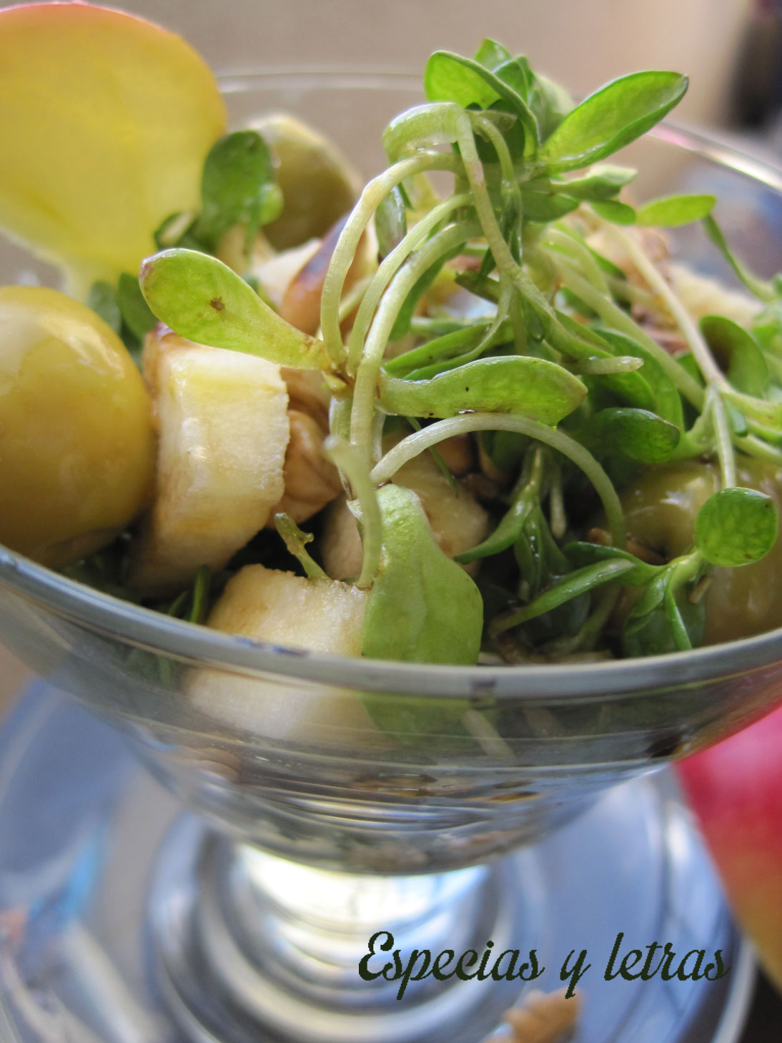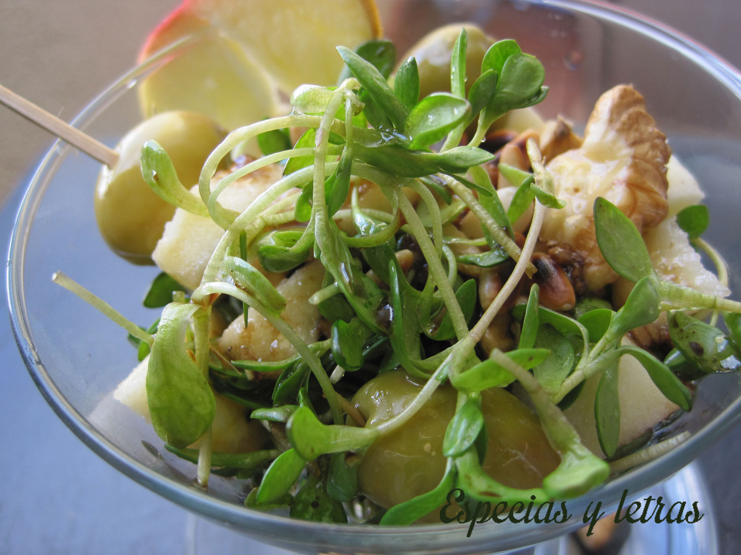 Escogemos bien la maruja para que no tenga ninguna mala hierba y lavamos. Ponemos en una fuente la maruja, la manzana cortada en trozos, la naranja sin lo blanco, las nueces, los piñones, las aceitunas y aliñamos con la vinagreta.