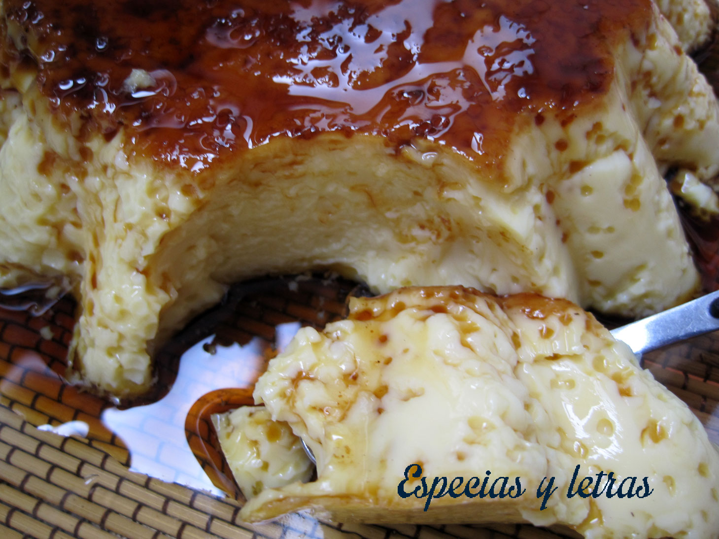 Ponemos el caramelo en el fondo de la flanera. Rellenamos y tapamos con papel de aluminio. Metemos la flanera en la fuente que teníamos con agua en el horno. Horneamos a 190º unos 40 o 50 minutos.