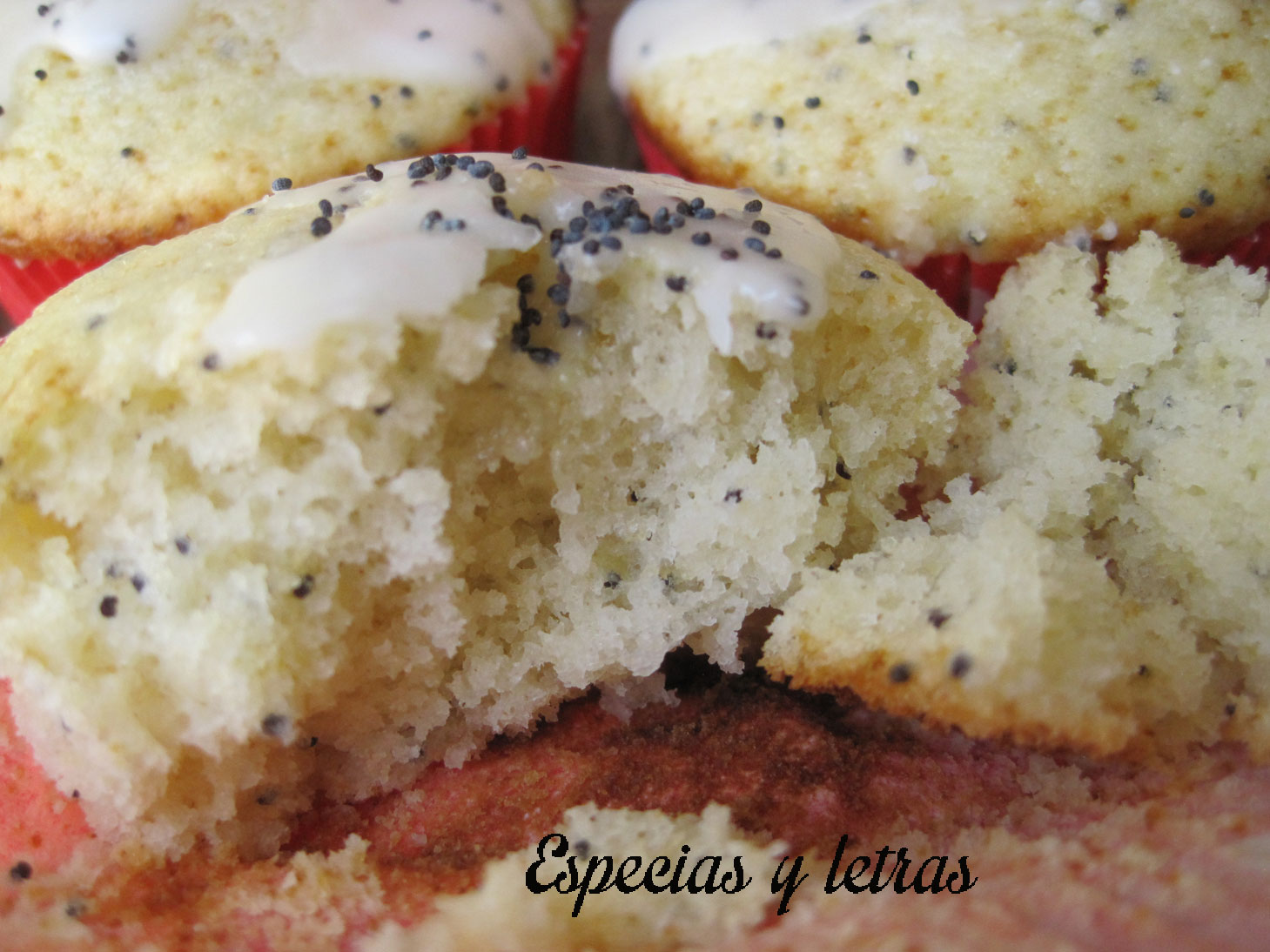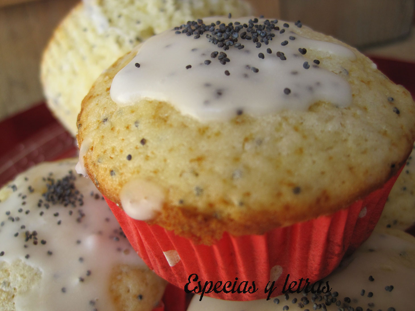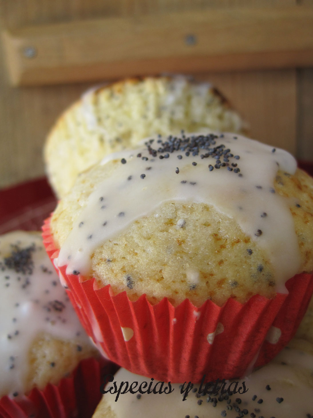 Precalentamos el horno a 220º, derretimos la mantequilla y tamizamos el harina con la levadura y la sal. Ponemos el huevo en un bol. Añadimos la mantequilla, el extracto de vainilla y la leche; batimos hasta conseguir una mezcla espumosa. Agregamos las semillas de amapola, la ralladura de limón, el zumo y batimos. Añadimos el harina; removemos hasta que la tengamos toda mezclada. Ponemos los moldes dentro de unas flaneras y los vamos rellenando sin llegar hasta arriba. Metemos en el horno unos 15 minutos. Mientras, hacemos el glaseado. La receta original no lleva, pero a mi gusta y quedan mejor, con mas sabor. Para hacer el glaseado solo tenemos que ir mezclando el azúcar glas con el zumo de limón, el zumo lo añadimos de poco en poco, para poder ver la consistencia que queremos. Añadimos unas semillas y mezclamos. Cuando los tengamos fríos solo nos quedaría ponerle el glaseado por encima.