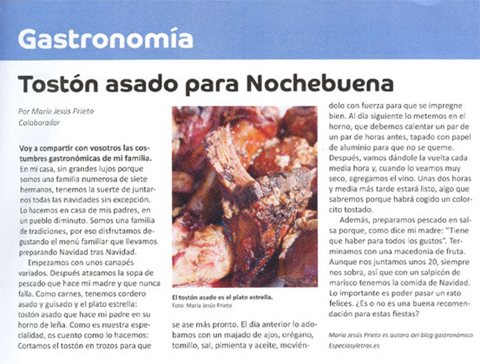 La receta que traigo hoy es una aportación. Hace un mes más o menos se puso en contacto conmigo Jesús del Pino, editor de la revista Mirador del Tormes, que ha empezado a publicarse en Salamanca. Me pidió unas recomendaciones para Navidad. Así que me puse manos a la obra. En el apartado de gastronomía con unos pequeños retoques, viene reflejado lo que se me ocurrió. Aquí os lo dejo para que le echéis un vistazo.