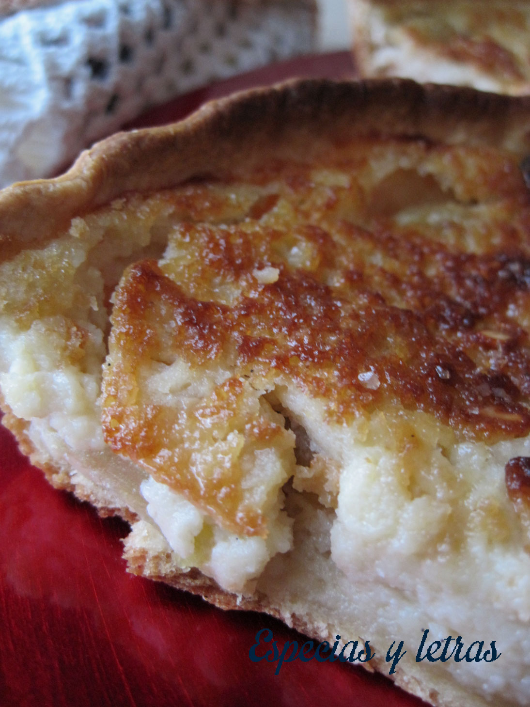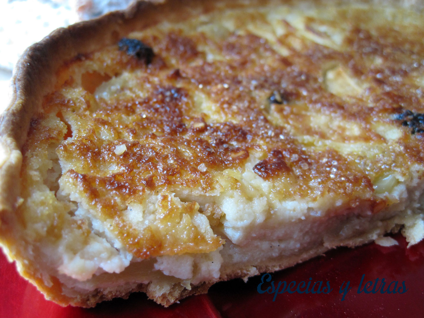 Enharinamos el molde, extendemos la pasta brisa y forramos en el molde. Pinchamos la base. Espolvoreamos el azúcar moreno y la almendra. Mientras hacemos el relleno, la dejamos en la nevera. Pelamos y cortamos los melapios en gajos que frotaremos con el limón. Hacemos el relleno batiendo los huevos, el azúcar y añadiendo la nata, el extracto de vainilla, la mantequilla derretida, la maicena y la almendra molida. Mezclamos bien para que no nos queden grumos y añadimos la compota que integraremos bien. Sacamos la masa de la nevera, colocamos los gajos de los melapios por todo el fondo, alternando con las uvas, pasas, arándanos y los frutos secos. Vertemos la mezcla de nata. Espolvoreamos con un poco de azúcar moreno. Metemos en el horno precalentado a 190º unos 35 minutos o hasta que esté doradita.